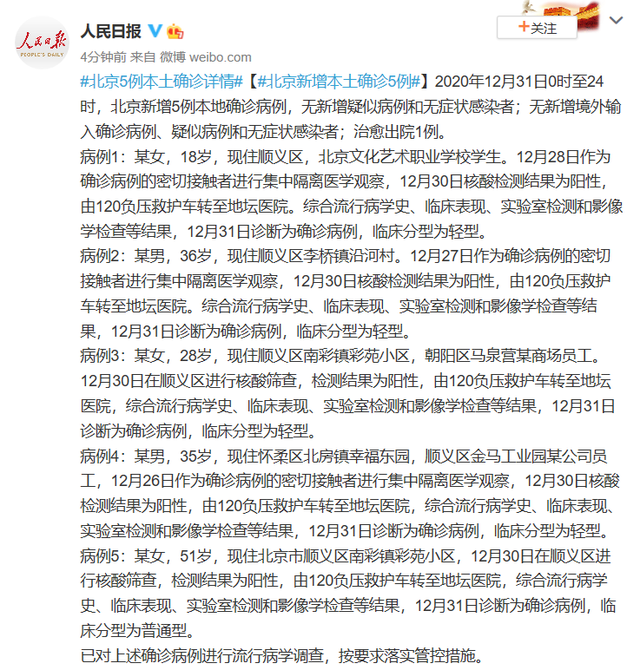 病例4:某男,35岁,现住怀柔区北房镇幸福东园,顺义区金马工业园某公司员工,12月26日作为确诊病例的密切接触者进行集中隔离医学观察,12月30日核酸检测结果为阳性,由120负压救护车转至地坛医院,综合流行病学史、临床表现、实验室检测和影像学检查等结果,12月31日诊断为确诊病例,临床分型为轻型。